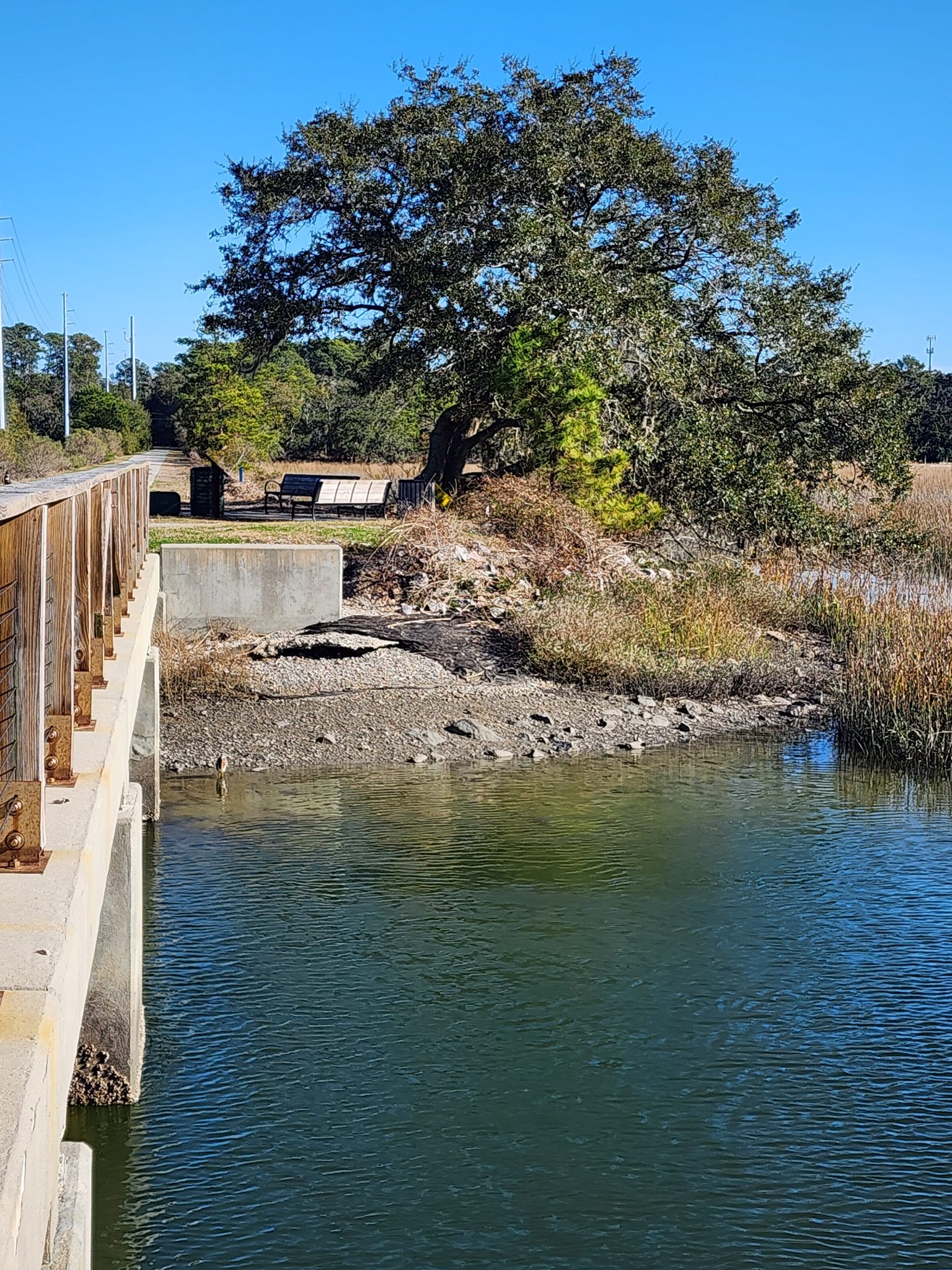 I met a transplant from Ohio fishing off the platform just over a mile down from where I join the path. The water was flowing rapidly under the bridge and into the salt marsh below where he was fishing. This same area, on both sides of the bridge has protruding platforms overlooking what will become mud flats in a few hours when the tide reverses course, back out to the sea.