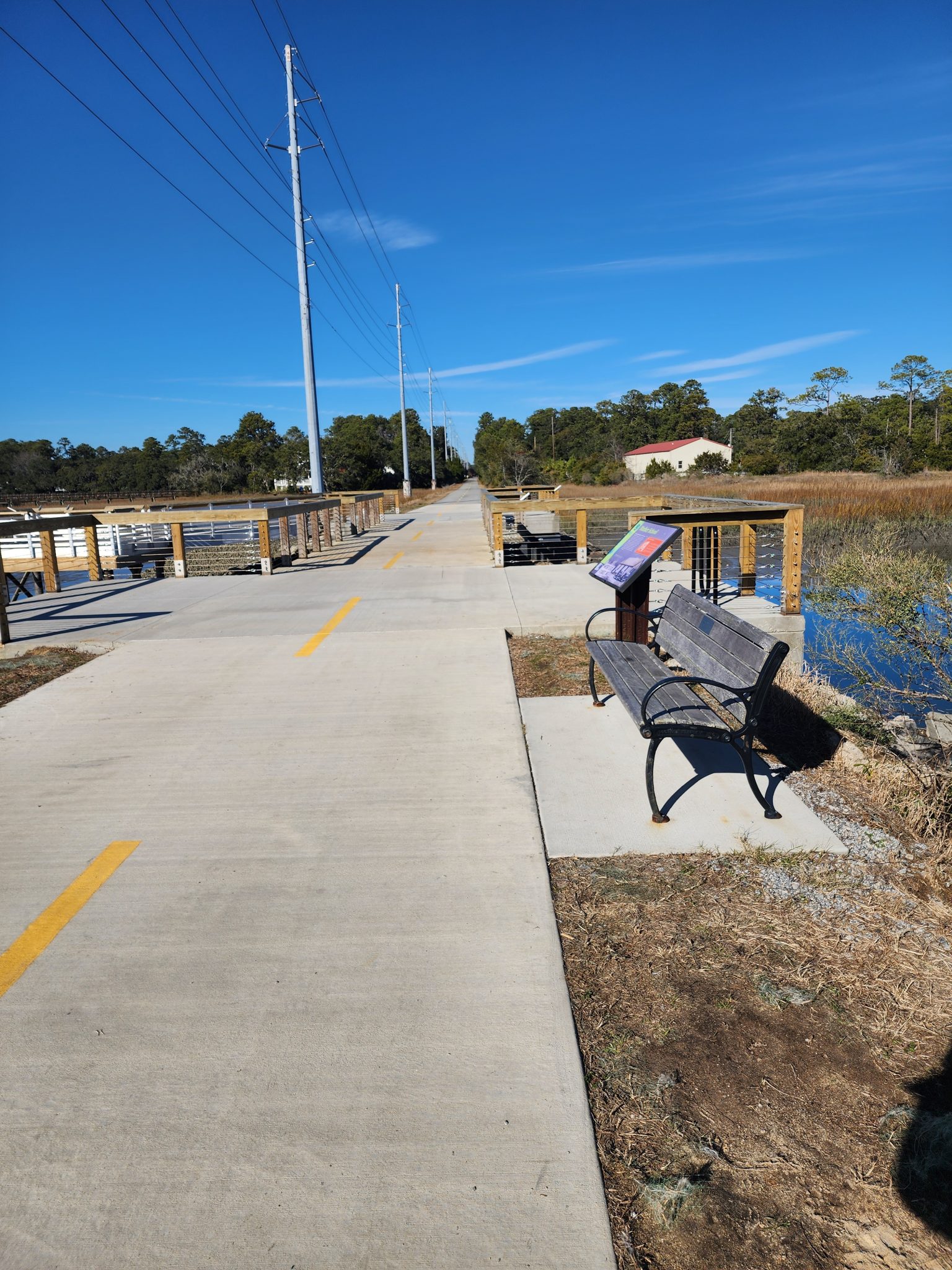 Hardly any other people on the trail. Calling it a rail may be a little overstated. It is paved concrete over what once was a railroad track that ran along what is now route 21. So, at least as far as I walked, one can see or hear the traffic. One section, very close to where I access the trail, crosses a brackish salt water marsh with a water route cutting through it out to the sea. There are nice homes with docks along the canal on one side and tall grass lines the opposite side.
