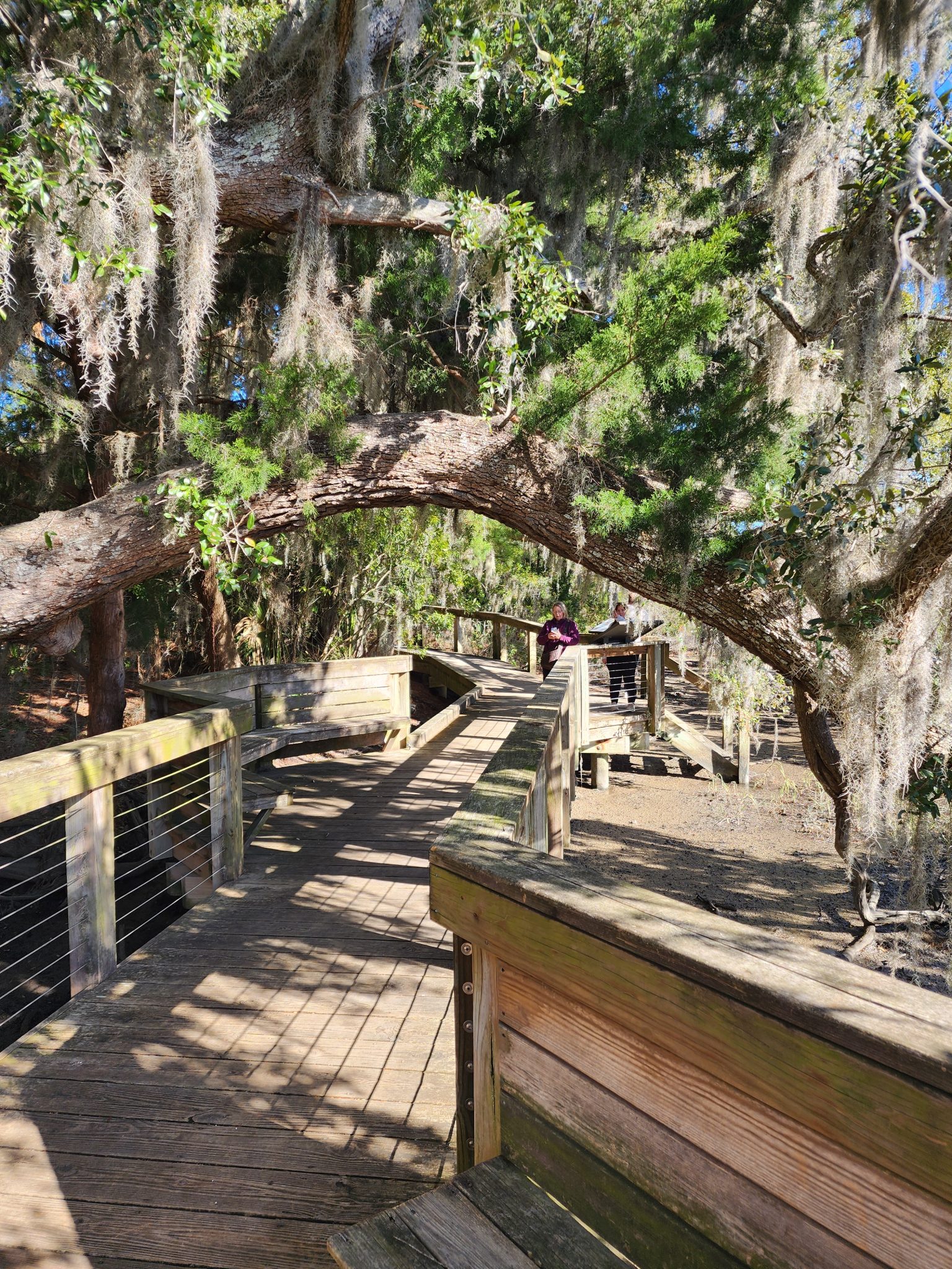 A particular concern of mine are alligators and poisonous snakes. My worry is more for Teddi, she has no experience with either, and beside losing her in the quicksand, the thought of her in the jaws of an alligator or being bitten by a Cottonmouth snake has weighed on my mind. He assured me that neither should bother me. Since the water is brackish with saltwater, the alligators avoid it, preferring fresh water. Apparently, the only time the alligators come into the tidal salt marsh, is to rid themselves of parasites. As for snakes, the salt marsh variety are not poisonous and he has never seen on off the trail, having walked the Spanish Moss trail for over a decade.