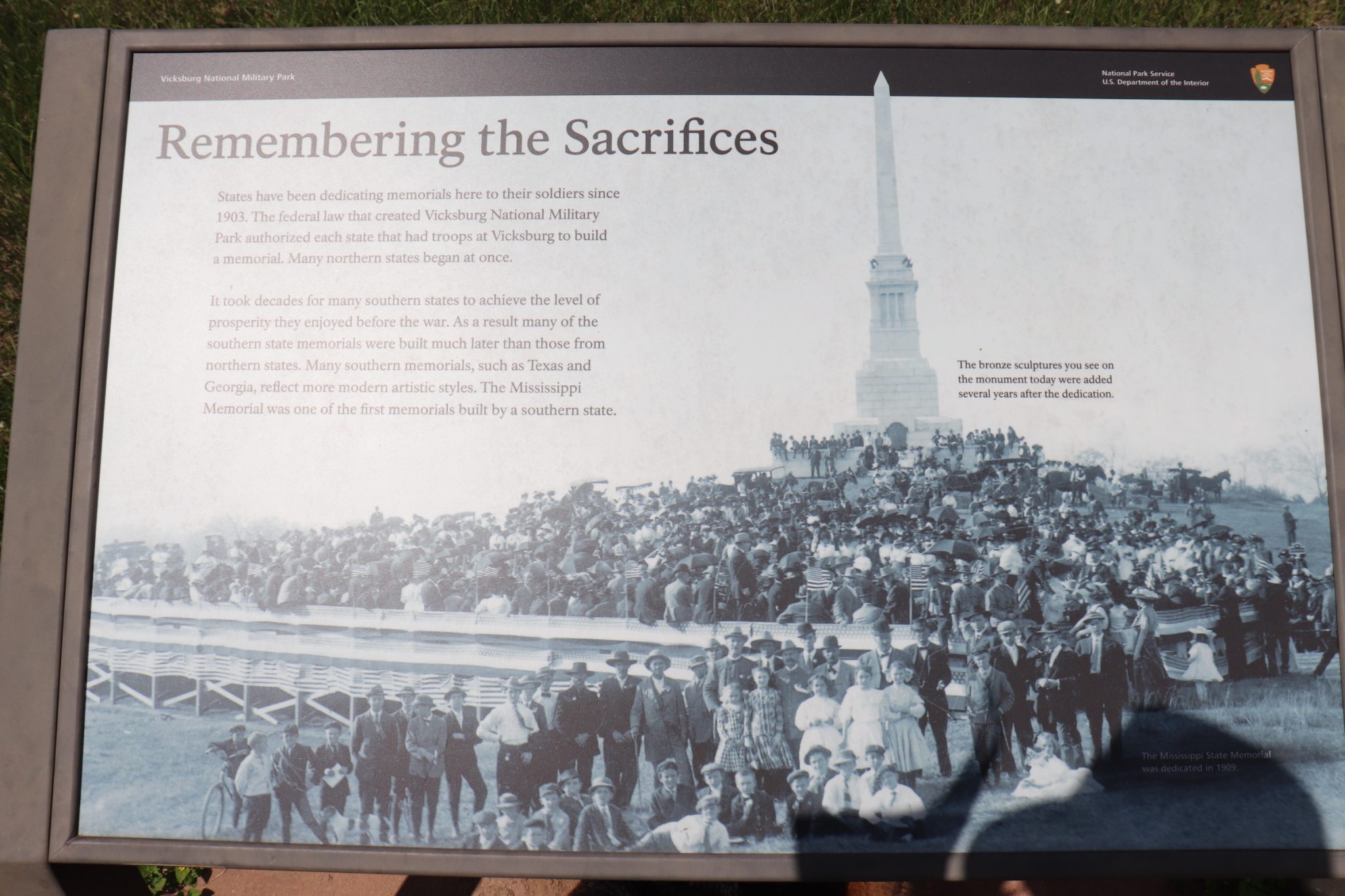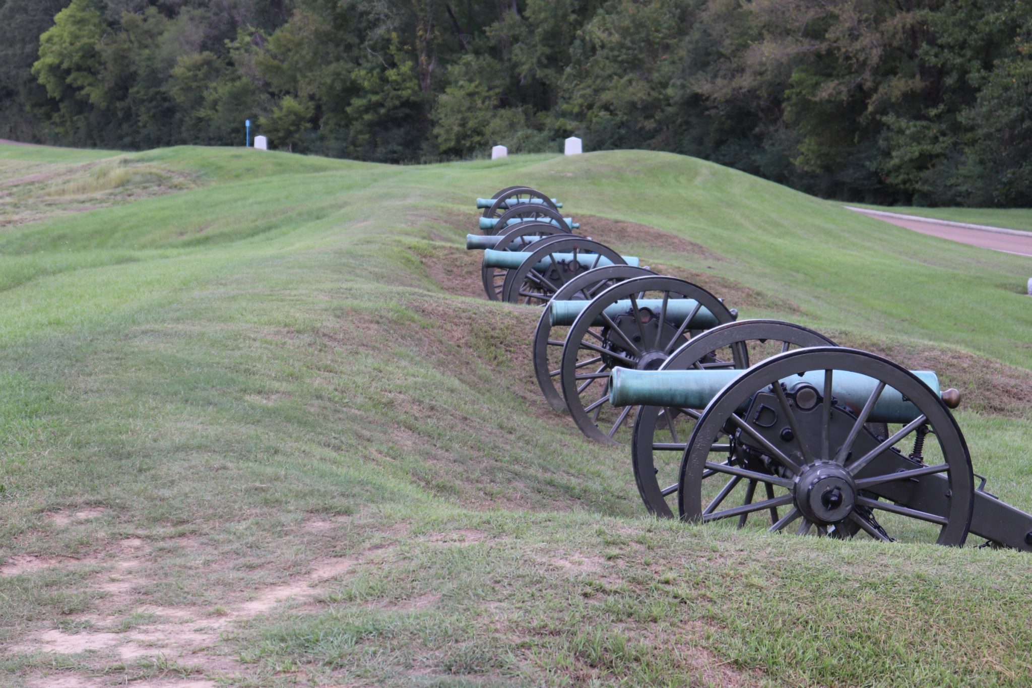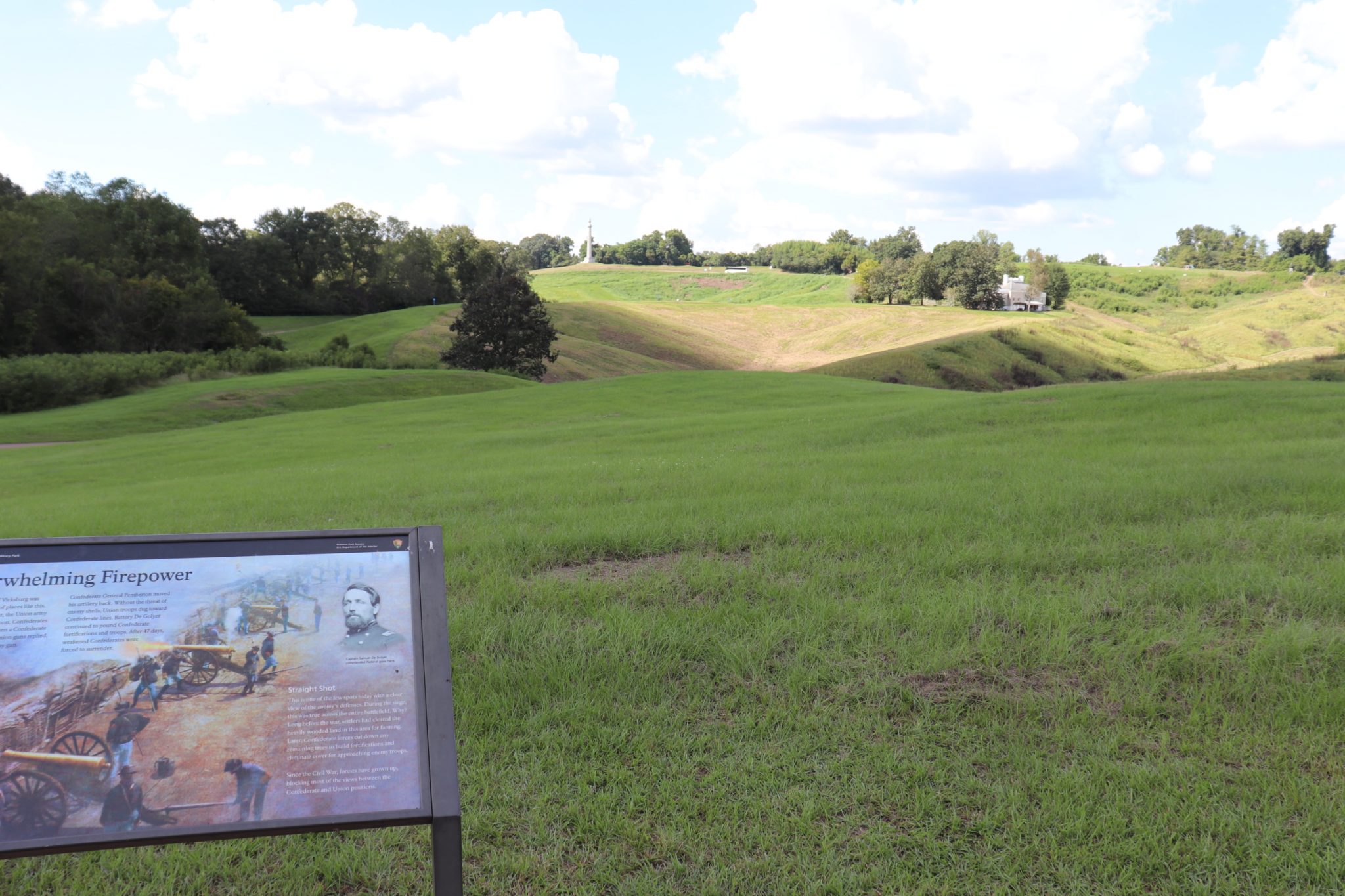 The temperature was above 90° and certainly in the 90’s regarding humidity. We walked about four miles yesterday and Teddie was just about done in by the heat and the humidity. This is October. It is hard to imagine what the conditions were like here in the summer of 1863. Day-after-day and night-after-night those fighting men, on both sides, endured the fear and hot humid Mississippi weather. Teddie and I found relief from the heat inside Steele Cottage, an antebellum home built in 1829, where she and I spent the night. The cottage is owned by the family that owns the mansion where breakfast was held this morning. Yesterday, I left Teddie in the air-conditioned room and went out for an early dinner at a local restaurant. When I came back she and I took a walk down to the Mississippi River. The local Vicksburg Arts and Historical Associations sponsored the painting of about thirty mural panels erected along the Waterfront. I think that is a great way to teach history. Of course, none of those panels showed the slaves loading the ships with cotton that sailed North to go to the merchants who continued to buy cotton throughout the entire war. Something Grant put a stop to. None of those panels depicted the slave markets, either. In fairness, none of those panels showed the graphic privation and starvation that the army of the South, and the the residents of Vicksburg, endured for the forty-seven days they were under siege.