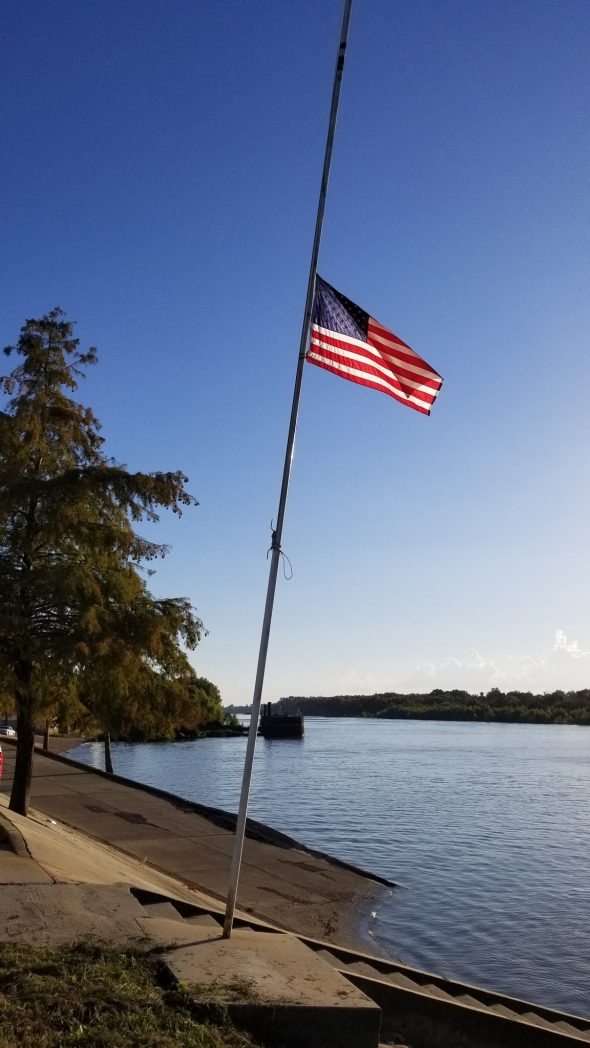 Teddie and I walked down to the water and I took a vial out of my pocket. I have carried that medicine vial containing the cremated remains of Alice King since it was entrusted to me by Wayne King on the day of Alice's memorial service, back in late July. Some of Alice is in a fast-moving stream in Montana. Some is in a river in Idaho. Yesterday, the sun was low in the sky and shining off the Mississippi River. I noticed a flag at half-staff, it seemed appropriate. I bent over, and I poured the remaining contents of that vial into the Mississippi River. There were two families of African Americans sitting in cars, talking to each other through opened windows, parked by the river. I could see that they watched me as I poured the contents into the water. I stood up, put the cap back on the vial, walked over to a trash receptacle, kissed that vial and deposited it in the container. With great sadness and contemplation, I walked back up the boat ramp to the street with Teddie.
